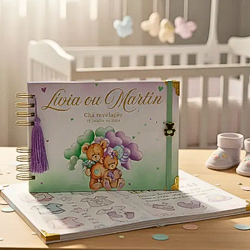 Transforme esse momento único em uma lembrança eterna! Compre já o seu Caderno Personalizado de Mensagens CHÁ REVELAÇÃO e registre cada emoção!
